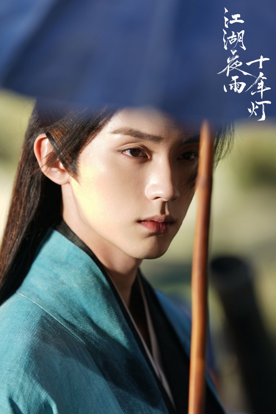 Высокий и статный юноша в халате с широкими рукавами был прекрасен, словно сошёл с картины, и его красоту было трудно описать словами. В руке он держал бумажный зонт, расписанный тушью, и его пальцы на рукояти зонта были длинными, словно выточенными из яшмы. Подол его светло-зелёных одежд колыхался под косым ветром и мелким дождём, будто цветущая ветвь.