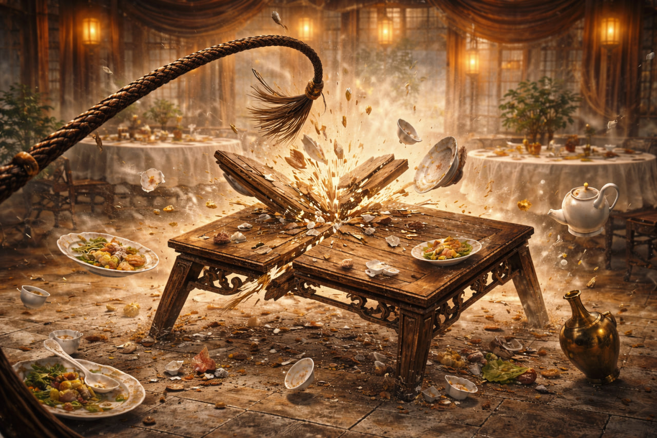 Эти слова случайно услышала Ницзин. Она тут же выхватила висевший на поясе длинный кнут и одним ударом разбила столик, стоявший рядом с насмешниками.