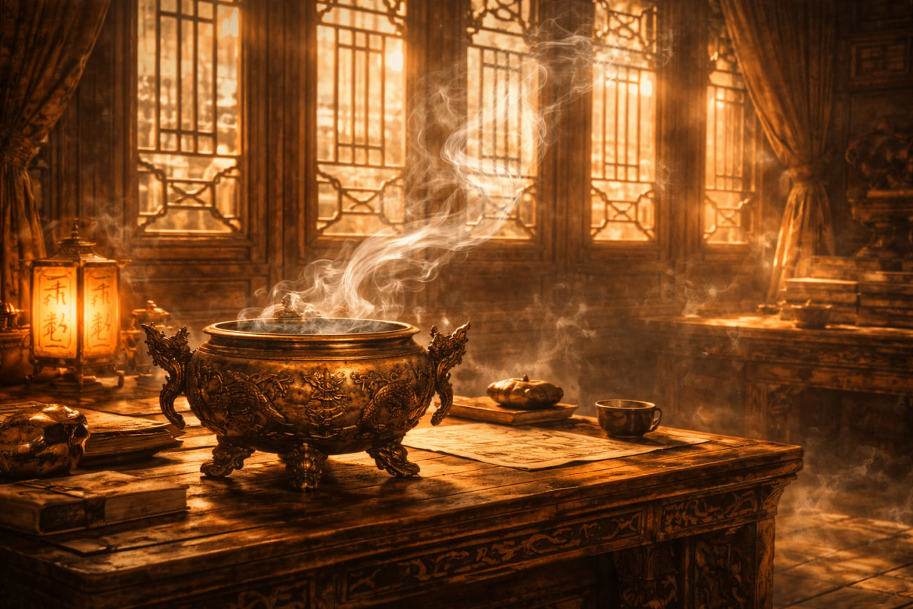 В это время в треногой курильнице струился лёгкий дымок. Окна были натёрты до блеска, и свет очерчивал изящные изгибы тонкой струйки дыма, поднимающейся в воздух.