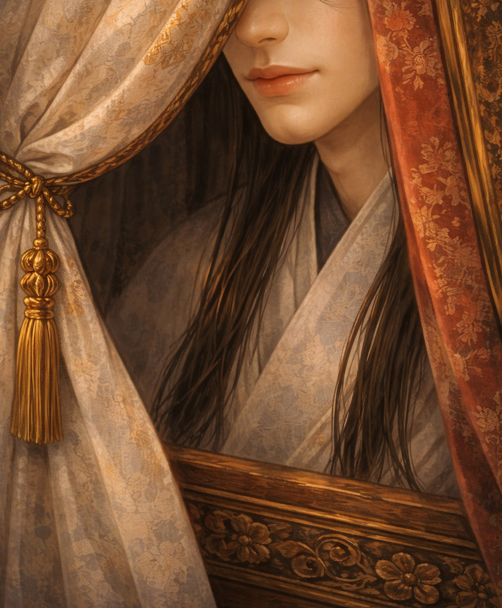 Занавеска повозки была слегка приподнята, и виднелся кусочек мужского подбородка, белого, словно нефрит, и тонкие губы.