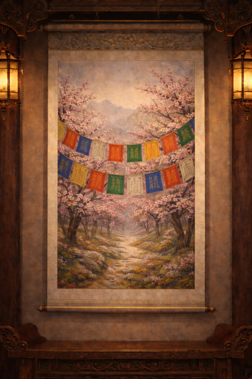 Внезапно она вспомнила, что позади одного из залов храма Дацыэнь была точно такая же персиковая роща, увешанная молитвенными флагами. Молитвенные флаги на этой картине ничем не отличались от тех, что были в храме Дацыэнь, так что, должно быть, это та самая роща.