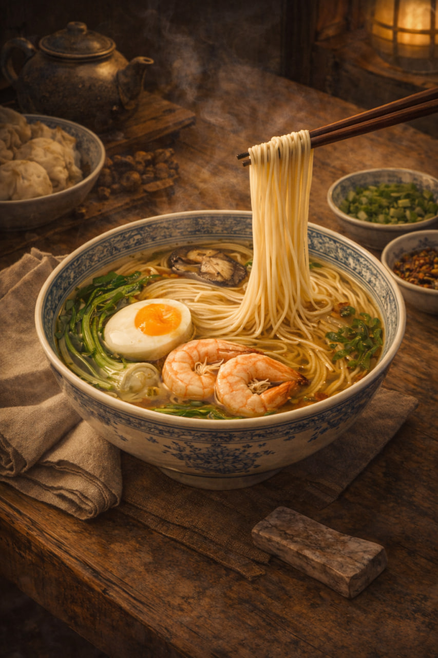 - Лапша долголетия (长寿面, chángshòumiàn) — блюдо из длинной непрерывной лапши, которое едят в день рождения, символизируя пожелание долгой жизни. ↩︎