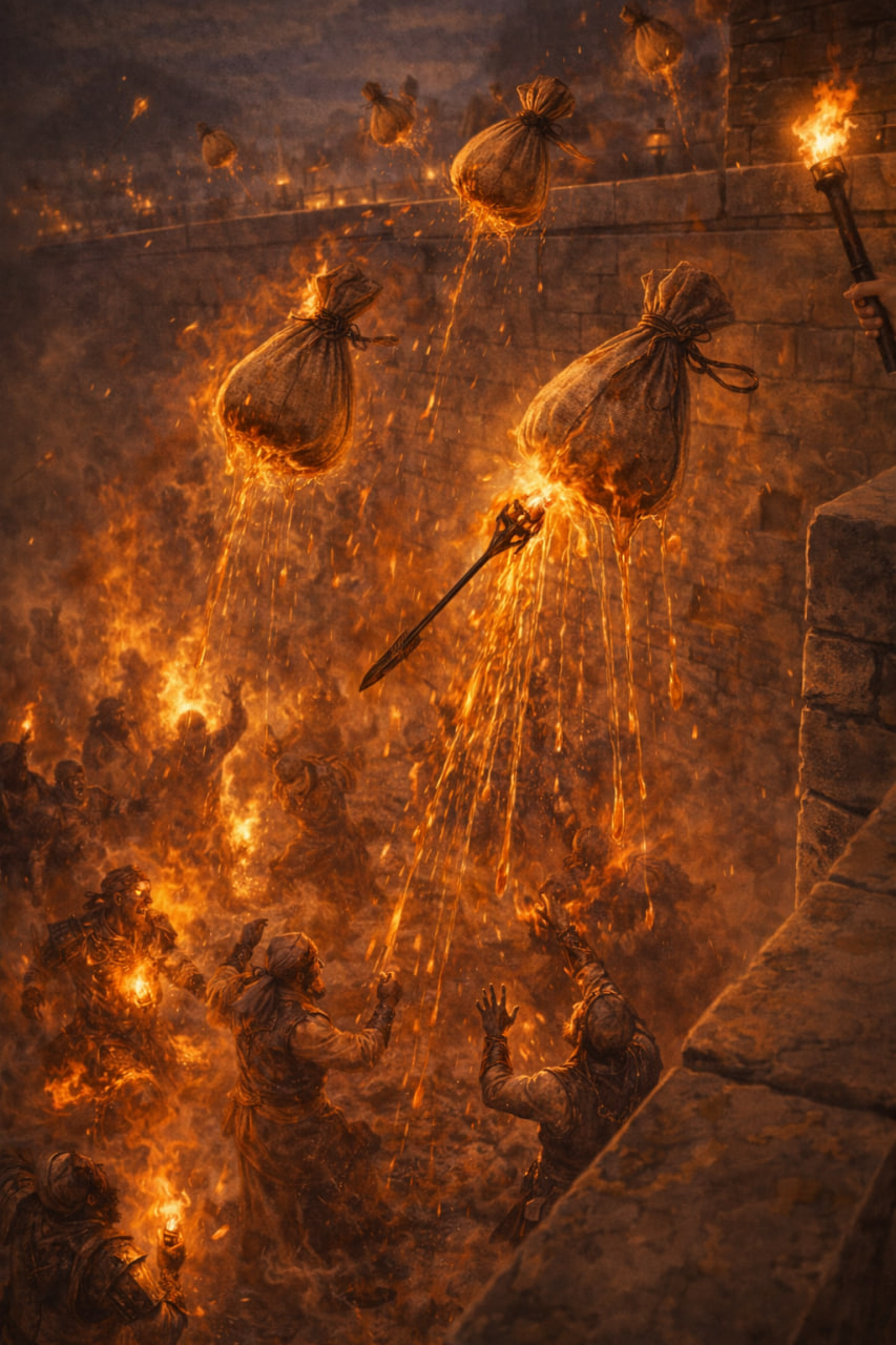 Если сбросить эти мешочки с тунговым маслом со стены наружу, а затем пронзить стрелой, то масло дождем прольется на тела морских разбойников внизу; если в этот момент бросить факел, то каждый удар попадёт в цель и подожжет врага.