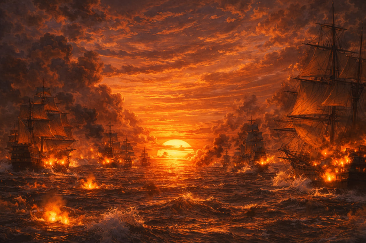 Это было время, когда Золотой Ворон клонился к западу, а вечерняя заря пылала словно огонь. Грохот пушек на море, по сравнению с прошлыми днями, немного утих.