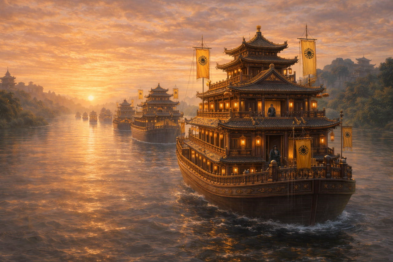 Скорбный ветер и горький дождь Янчжоу не распространились на Великий канал, отдаленный на сотни ли. Более десяти величественных казённых кораблей Великой Инь плыли по руслу реки.