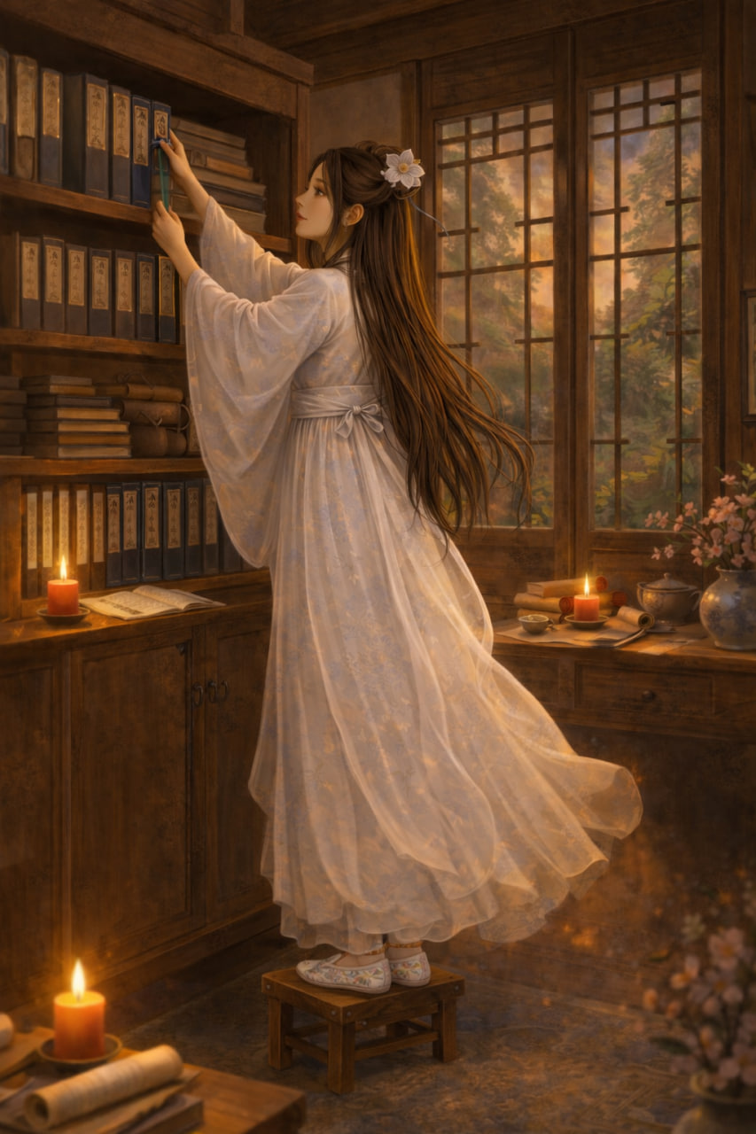В кабинете уже горели два настенных светильника. Жун Шу стояла на низкой скамеечке, тянувшись рукой за книгой сутр.