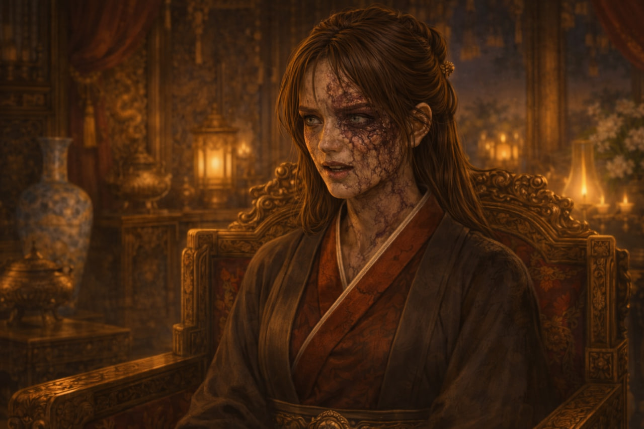 Императрица Ци подняла взор. Когда её взгляд упал на старуху, тонкие брови невольно дрогнули — лицо старой женщины было сплошь покрыто переплетающимися шрамами.