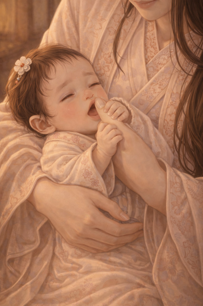 Первым делом, очнувшись, она захотела увидеть ребёнка. Тогда Чжоу-момо и принесла Чжао-Чжао. Малышка была очень слабой, её плач напоминал мяуканье котёнка. Но оказавшись в руках матери, она разжала кулачки и крепко ухватилась за её большой палец, причмокивая крошечным ртом.