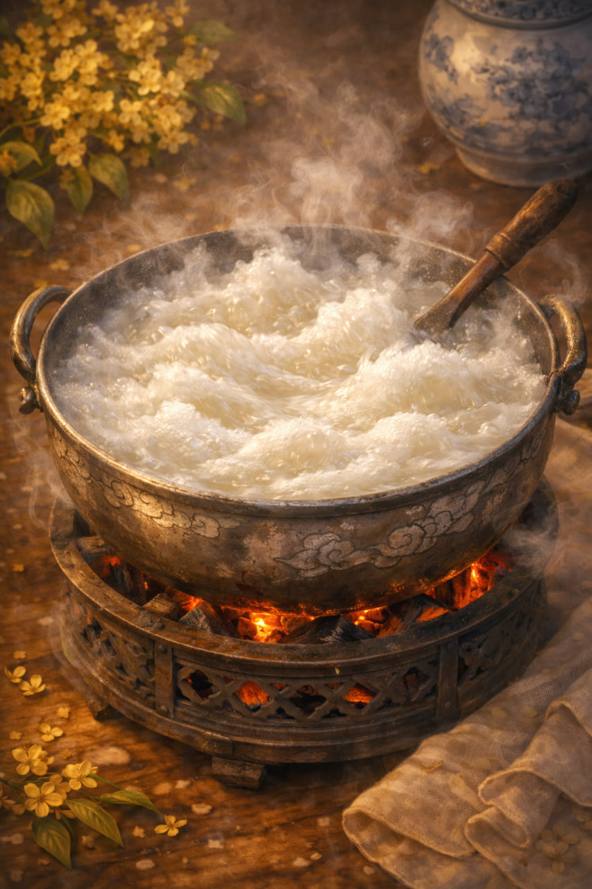 Молочно-белый бульон в котелке над жаровней бурлил, словно волны, вздымающие снег на чистой реке.