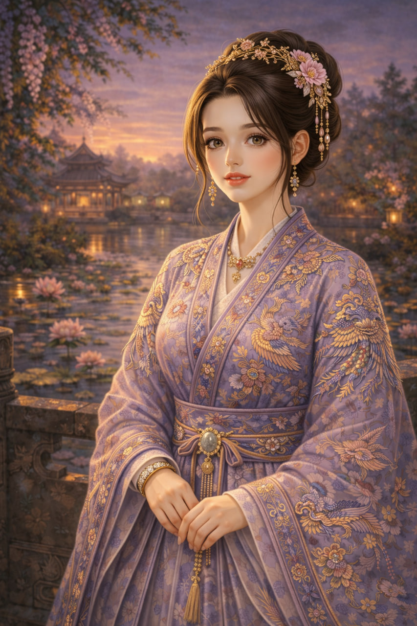 На Жун Шу сегодня было повседневное платье наследной принцессы дымчато-фиолетового цвета, расшитое узором из восьми сокровищ, облаков жуи и птиц луань и фениксов.