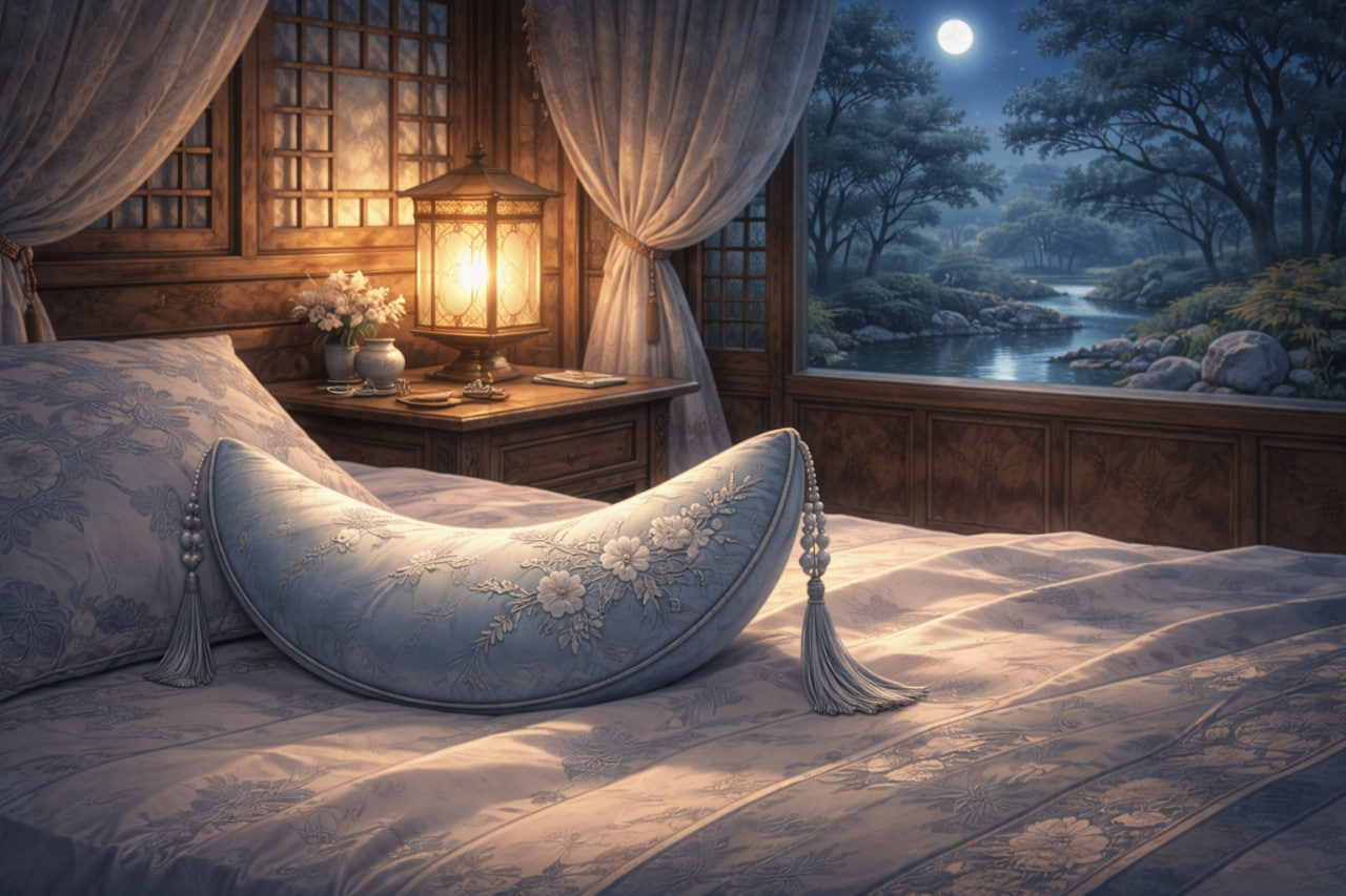 - Подушка-луна (月儿枕, Yuè’ér zhěn) — небольшая подушка в форме полумесяца, популярная в быту знатных дам. ↩︎