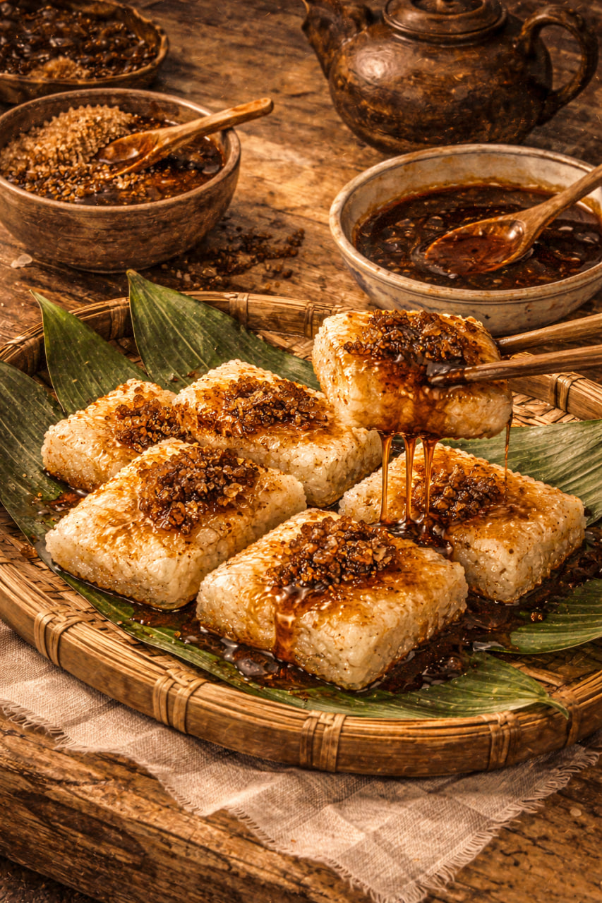 - Цыба (糍粑, cíbā) — традиционное китайское блюдо, которое готовят из сваренного на пару клейкого риса, растолченного в деревянной ступе до состояния однородной тягучей массы. Полученное «тесто» формуют в небольшие лепёшки или шарики. Их можно обжаривать до хрустящей корочки, запекать или варить. Чаще всего цыба подают сладкими, обвалянными в пудре из жареных соевых бобов и политыми сиропом из тростникового сахара. ↩︎