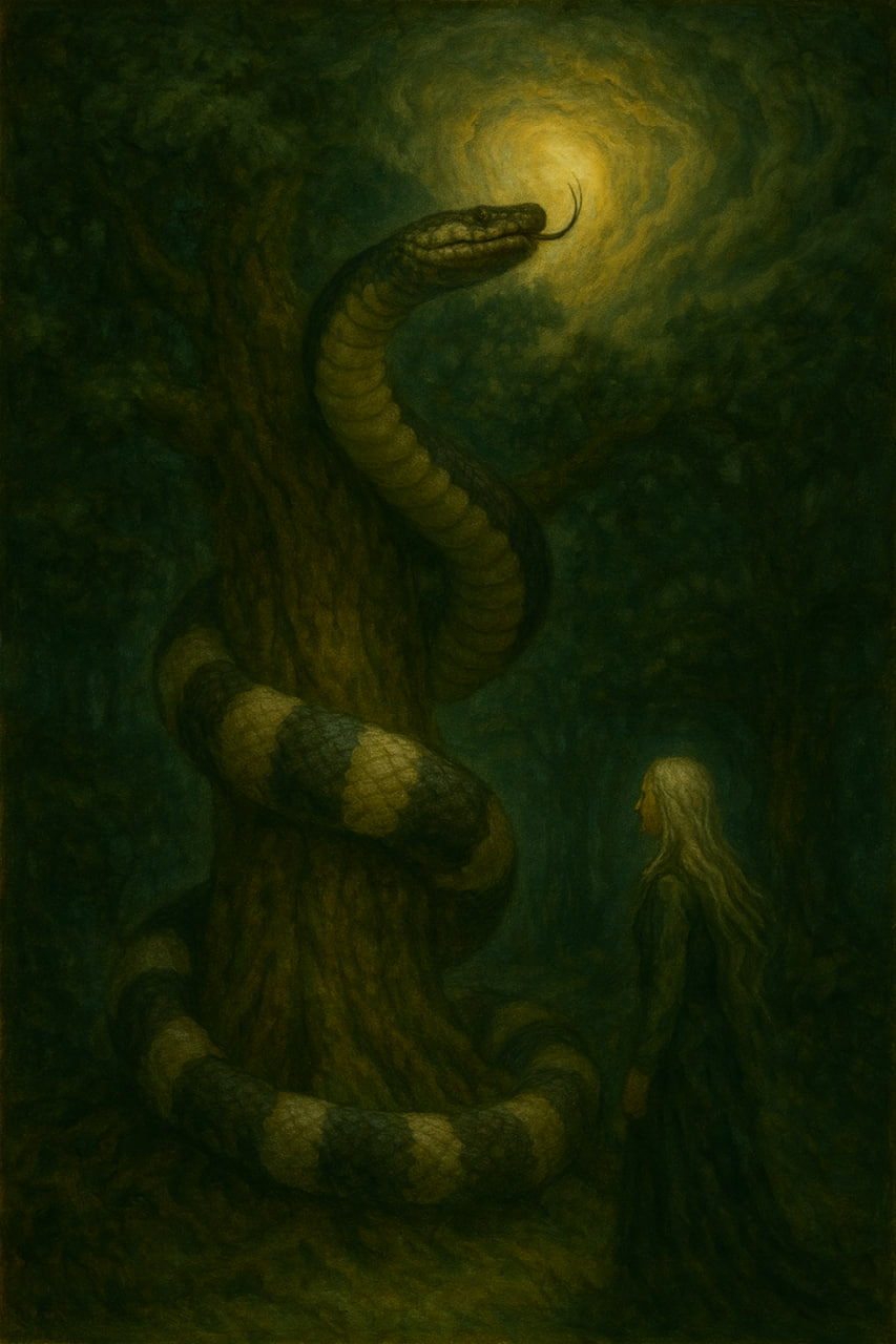 На коре древа проступили чёрно‑белые узоры, становясь всё отчётливее, пока перед глазами всех не проявилась гигантская змея с белым телом и чёрными полосами. Она обвилась вокруг ствола, подняла голову к небу и зашипела, высовывая раздвоенный язык.