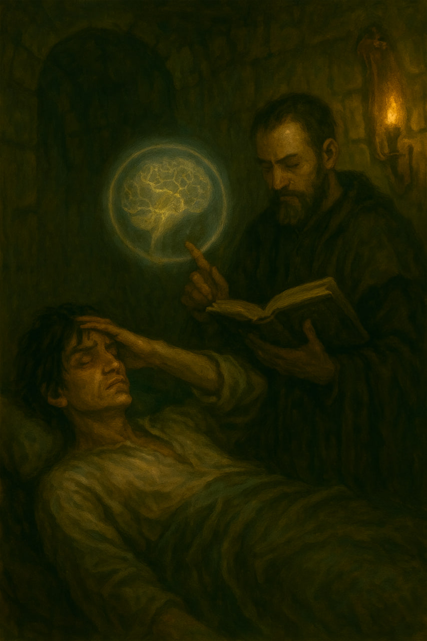 Наложить дважды “Лечение тяжёлых ран”, дважды “Лечение смертельных ран”. Под наблюдением видно: сосуды срослись, кровоток восстановился, но повреждённая часть мозга не регенерировала…»