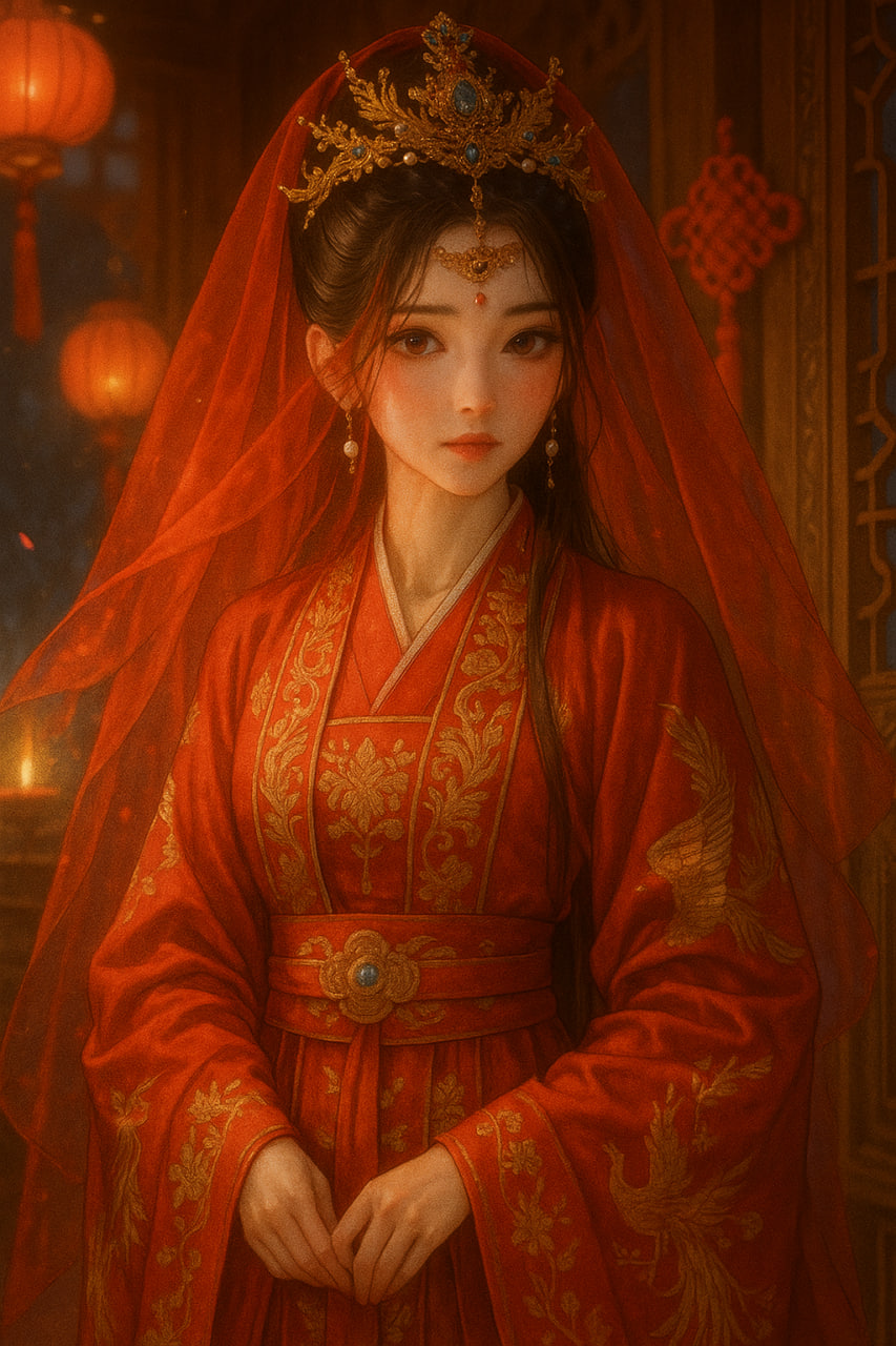 Когда он приподнял покрывало, Лу Нянь, озорно изогнув губы, встретила его взгляд. В алом наряде, с лицом, белым как снег, и глазами, сиявшими в отблесках свечей, она была ослепительно хороша. Он замер, не в силах вдохнуть.