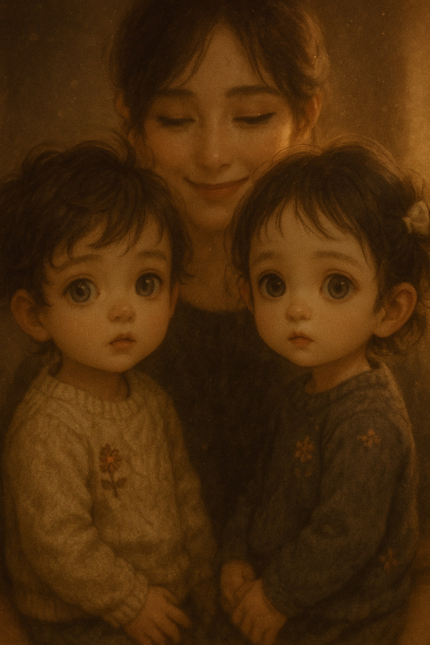 На ней — два младенца. По ним ещё нельзя было сказать, кто мальчик, а кто девочка: один был в розовом пуховике с зайчиками, другой — в синем, с котами. Лица почти одинаковые, как отражения в зеркале.