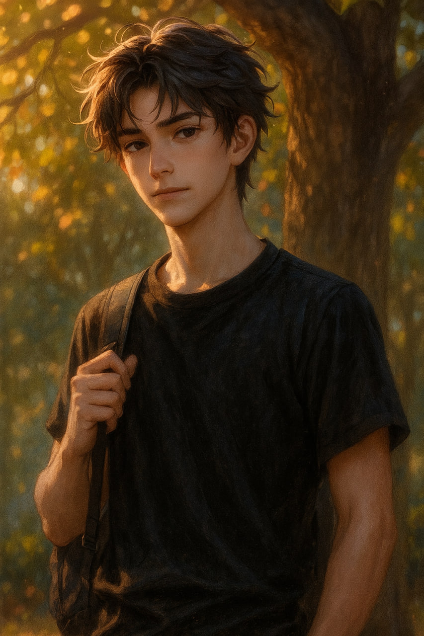 Он стоял под платаном, высокий и тонкий, с чуть сутулыми плечами, с рюкзаком на одном ремне. На нём была простая чёрная футболка. Мрачный цвет, но на нём смотрелась так, будто создана именно для него.
