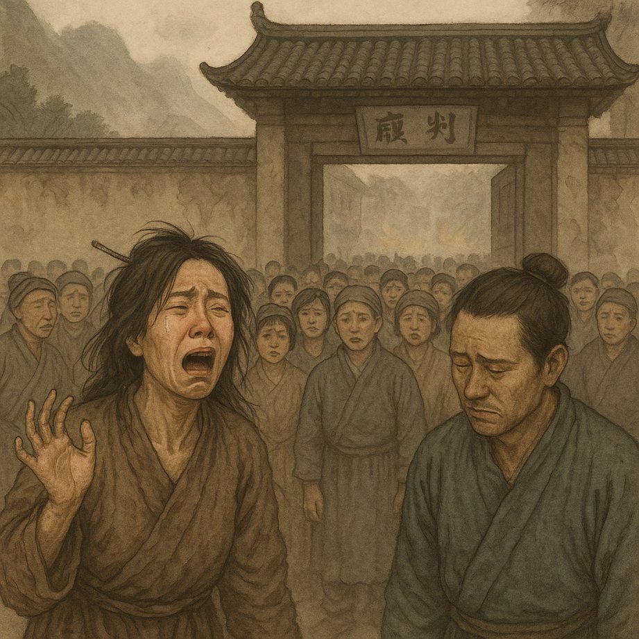 Они стекались на площадь перед ямэнем — домом уездного чиновника. Перед воротами стояла женщина лет тридцати с растрёпанными волосами и перекошенной шпилькой в них;