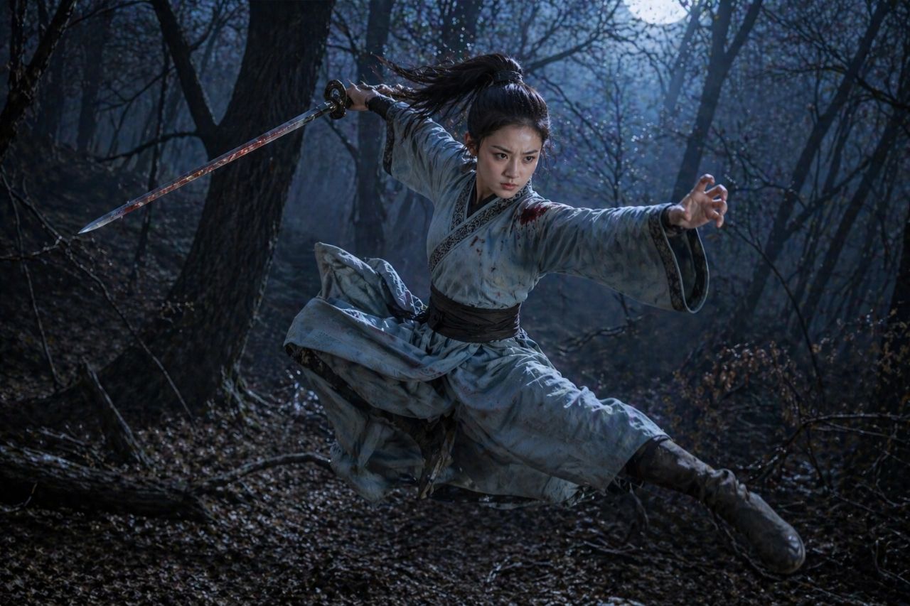 Когда мастера сходятся в поединке, скорость всегда достигает пика. Мгновенно раздались шуршащие звуки шести выхватываемых мечей. При свете холодной луны двое слева моментально взмыли в воздух, с резким криком, полные решимости, бросились на маленькую девушку. В момент достижения наивысшей точки боевые мечи в руках с двумя странными холодными дугами резко опустились, мощь подобна грому.